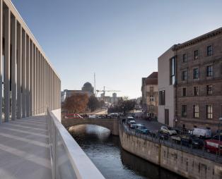 Πόλος έλξης χιλιάδων επισκεπτών, καθημερινά, πλέον απέκτησε μία πέτρινη πρόσοψη με λεπτούς κίονες, που φέρει την υπογραφή του αρχιτέκτονα David Chipperfield, του ανθρώπου που ανασχεδίασε την «περιοχή» το 1999. Το εν λόγω κομμάτι θα λειτουργήσει ως η νέα είσοδος για το σύμπλεγμα των πολιτιστικών κτιρίων, ενώ αξίζει να σημειωθεί ότι υπάρχει και μια μεγάλη μαρμάρινη βεράντα, που επίσης είναι επιβλητική και εντυπωσιακή.
