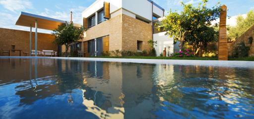 Οι βίλες περιβάλλονται απο πετρόχτιστους τοίχους, προστατεύοντας έτσι την ιδιωτικότητά σας και παράλληλα σας παρέχουν ανεμπόδιστη πανοραμική θέα στους Κρητικούς λόφους, στους απέραντους ελαιώνες και πορτοκαλεώνες και στα Λευκά Όρη. Αντανακλώντας την θέα, οι βίλες έχουν κτισθεί με βάση την πέτρα, το μέταλλο και το γυαλί, δημιουργώντας μια αίσθηση διαφάνειας στο κάθε κτίριο. Σε όποιο χώρο και να βρίσκεται ο επισκέπτης, έχει η δυνατότητα να δεί στους εξωτερικούς χώρους, σαν να μην υπάρχουν τοίχοι.