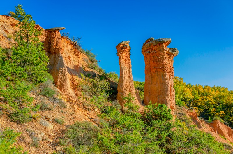 Τα «μπουχάρια» και τα «νοχτάρια» συνθέτουν ένα μοναδικό φυσικό τοπίο που καθηλώνει τους επισκέπτες. Ένα ιδιαίτερο γεωλογικό φαινόμενο, μοναδικό σε όλη την Ελλάδα, που αξίζει να δει κανείς από κοντά αν βρεθεί στην περιοχή. Πρόκειται για φυσικές γεωμορφές που προήλθαν από τη διάβρωση του εδάφους σε διάστημα χιλιάδων χρόνων. Έχουν το σχήμα χωμάτινης κολόνας και αποτελούνται από άμμους, κροκάλες, μάργες και αργίλους, με πιθανή «συγκολλητική» ύλη οξείδια του σιδήρου και διοξείδιο του πυριτίου. Την κορυφή των κολόνων αυτών καλύπτει μια σχιστολιθική πλάκα που έπαιξε το ρόλο της ομπρέλας στην εξέλιξη του σχηματισμού Ο αριθμός τους φτάνει τα 20 και το ύψος τους ποικίλει από 2 μέχρι 6 μέτρα.