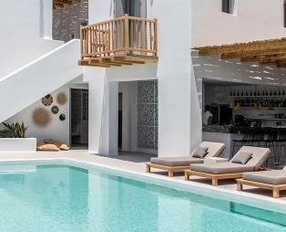 Το κυκλαδίτικο λευκό, το εμπνευσμένο minimal design και οι ιδιαίτερες boho-chic πινελιές, όπως τα ρετρό φωτιστικά, τα ψάθινα χαλιά και τα φυσικά υλικά στα προσεγμένα έπιπλα, δημιουργούν έναν ιδιωτικό παράδεισο που σίγουρα δεν θα θέλεις να εγκαταλείψεις.